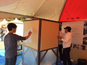 施主 かとうさん DIYでしっくい塗り中*完成お披露目レセプションにて 左:施主 かとうさん お隣り:設計GM2 木本さん 施工のくわしいレポートはおふたりのブログでもご覧いただけます。